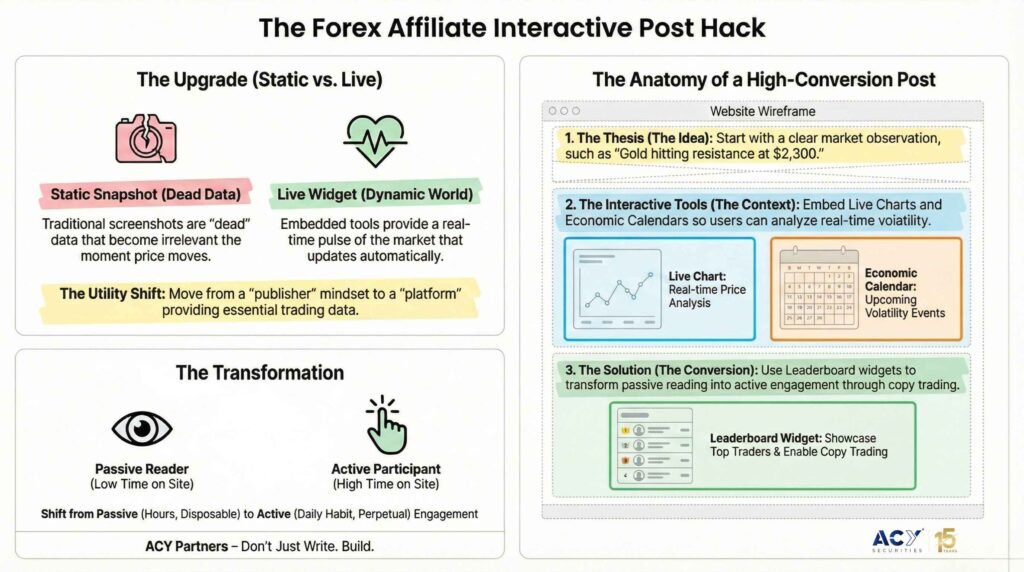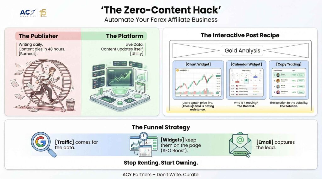 - Passive Engagement: Passive trader engagement strategies utilizing ACY’s free Finlogix widgets build trust and authority without constant manual updates.